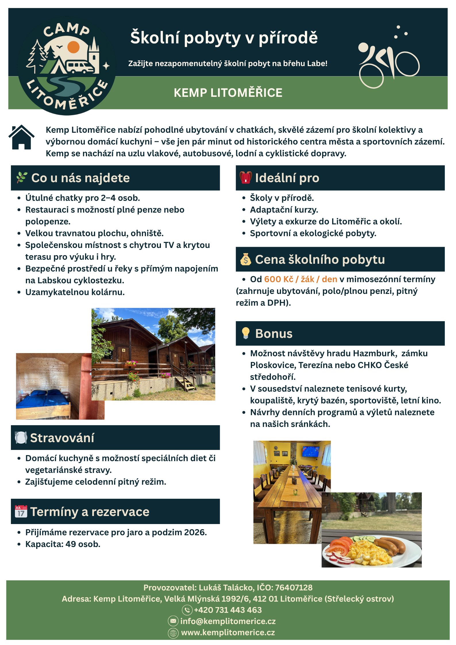 Kemp Litoměřice nabízí ideální zázemí pro školy v přírodě, adaptační kurzy, výlety i sportovní pobyty.